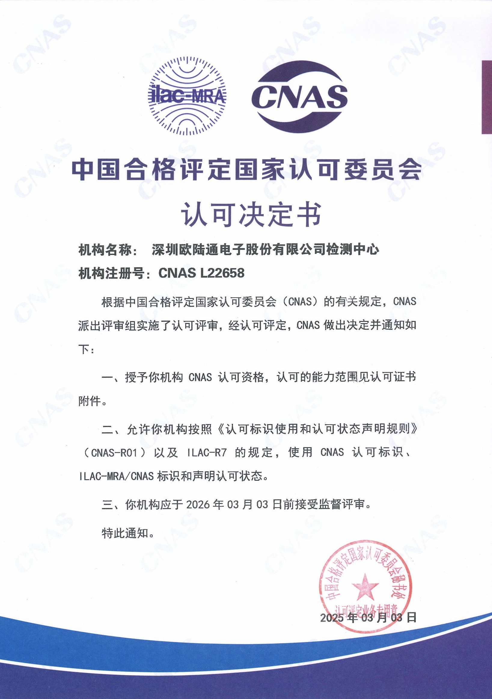 近日,歐陸通實(shí)驗(yàn)室順利通過了中國合格評定國家認(rèn)可委員會(CNAS)資質(zhì)評審及合格評定,榮獲國家級CNAS實(shí)驗(yàn)室認(rèn)可證書,標(biāo)志著公司實(shí)驗(yàn)室的測試能力與管理體系已達(dá)到國際互認(rèn)水平,檢測報(bào)告和結(jié)果可實(shí)現(xiàn)在全球上百個(gè)國家和地區(qū)的互信認(rèn)可。